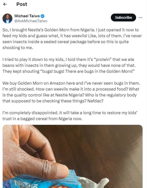 “We buy Golden Morn on Amazon here and I’ve never seen bugs in them. I’m still shocked. How can weevils make it into a processed food? What is the quality control like at Nestle Nigeria? Who is the regulatory body that supposed to be checking these things? Nafdac?”