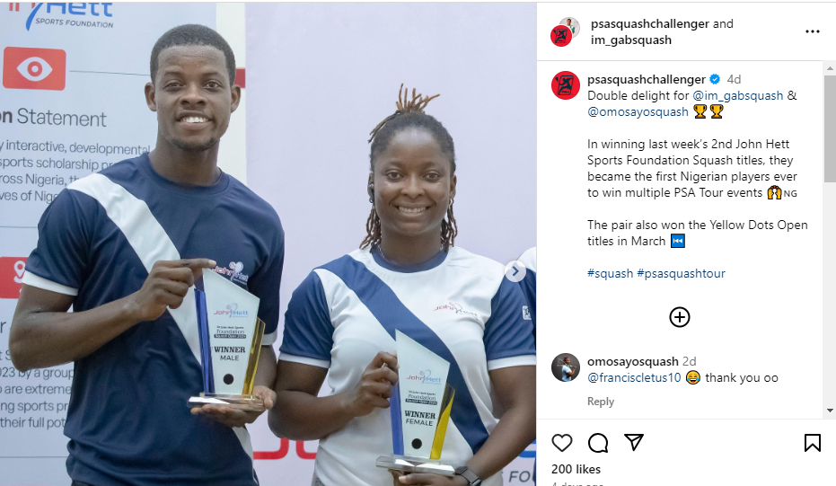 Gabriel Olufunmilayo and Busayo Olatunji became the first Nigerian players to wrap up multiple PSA Squash tour titles, winning the 2nd John Hett Sports Foundation Squash tournament in Lagos.